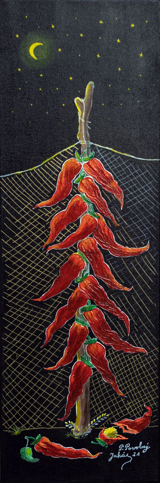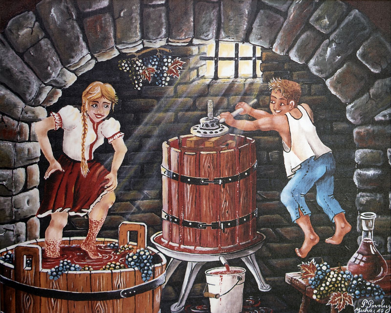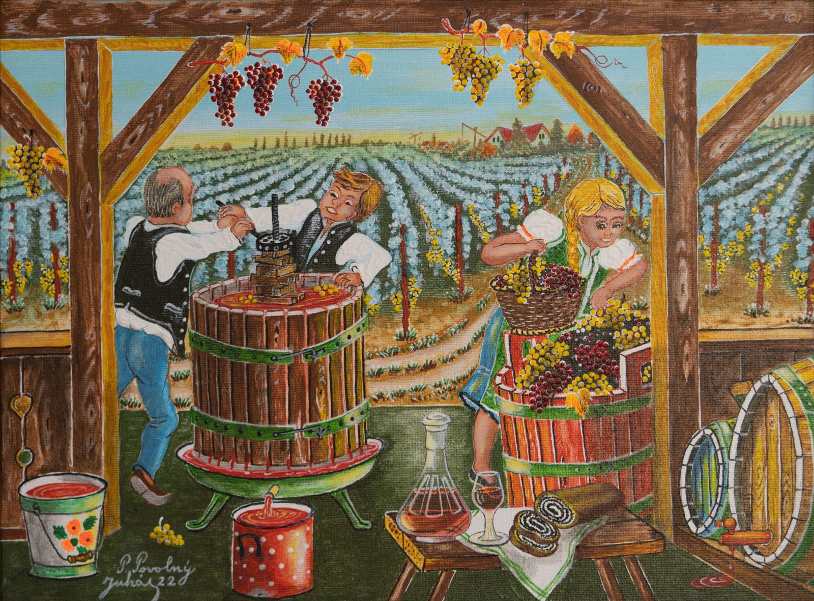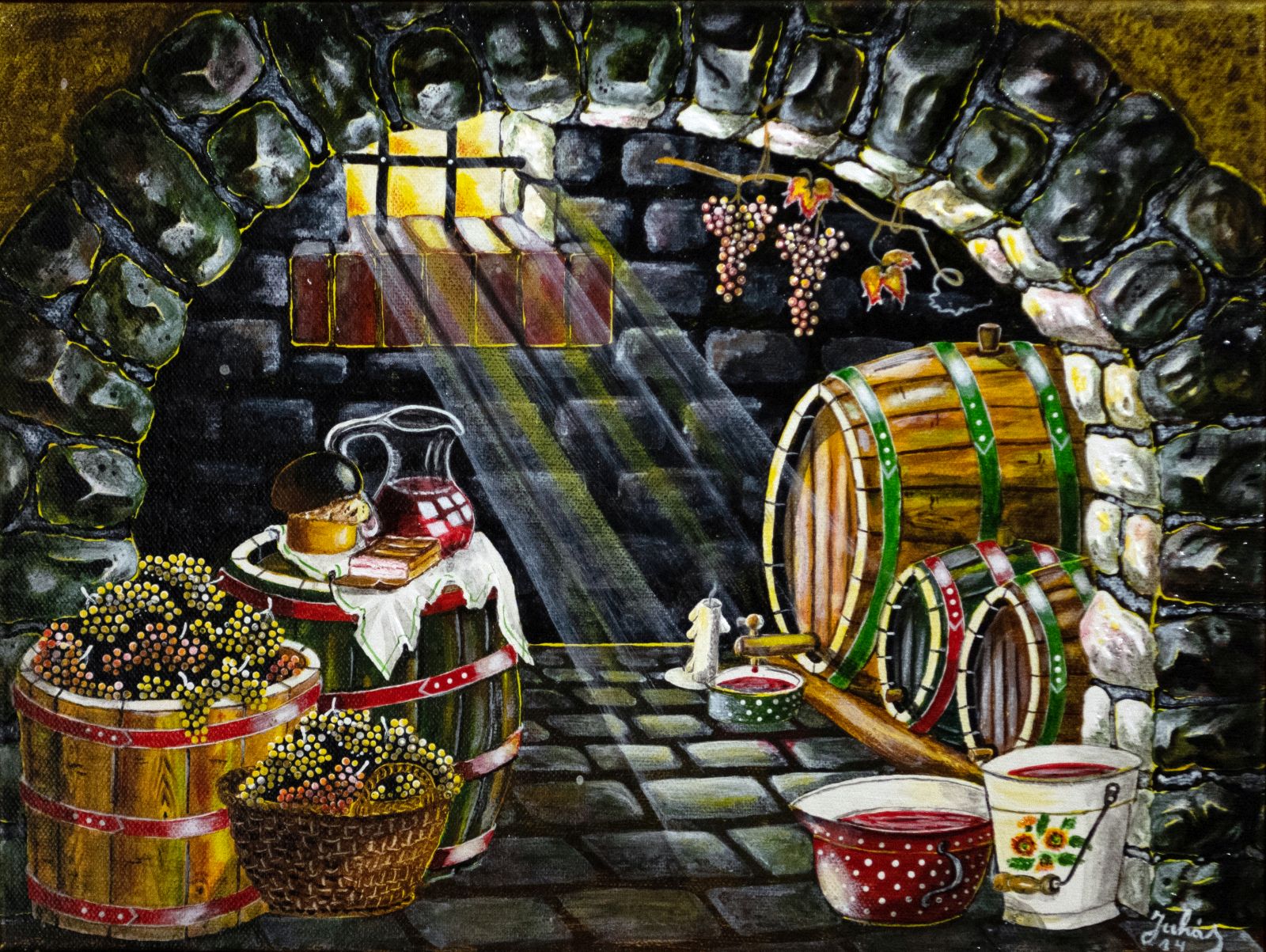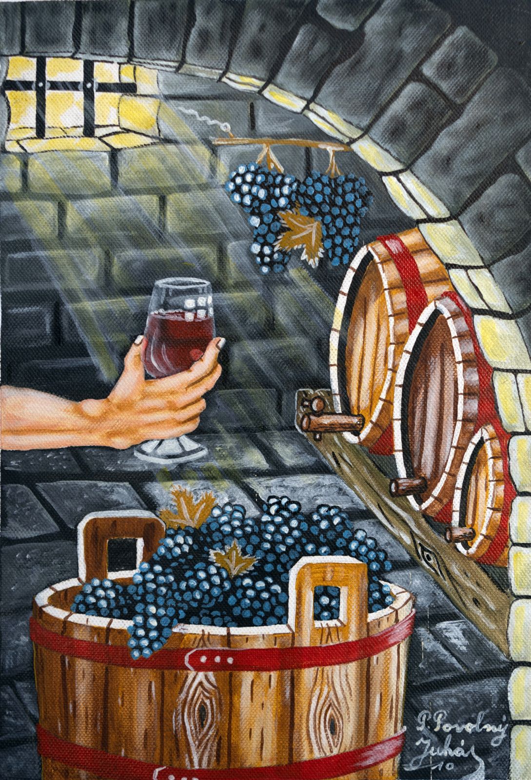 Pavel Povolni Juhas is an artist whose work primarily explores themes of grapes, wine, vineyards, and wine cellars. His pieces bring light that illuminates these spaces, creating an atmosphere of intimacy and richness. Juhas masterfully depicts all aspects of the wine tradition – from golden grapes to the tranquil space of the cellar – where light and shadows play a key role. On his canvases, wine is not just a beverage but a symbol of culture, tradition, and the enjoyment of life.